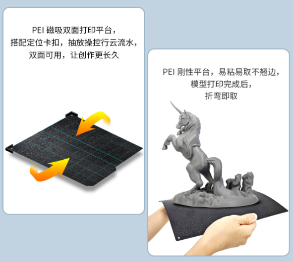 PEI磁吸雙面打印平臺(tái),不僅雙面可用,在打印過程中更是易粘易取不翹邊,內(nèi)置的收納盒設(shè)計(jì),不丟失每一個(gè)小細(xì)節(jié)。