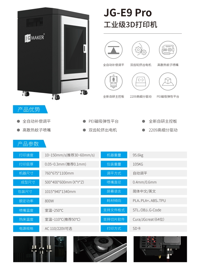 極光創(chuàng)新JG-E9 Pro作為極光創(chuàng)新工業(yè)級FDM系列3D打印機的王牌產(chǎn)品,在教育科研、工業(yè)制造等領(lǐng)域深受好評,除了擁有500*400*600mm的較大成型尺寸之外,全封閉空間的鈑金結(jié)構(gòu)機身,不僅可以很好的控制機箱溫度,有效提升打印精度。同時,該款機器的內(nèi)置配置也是直接拉滿,集成化設(shè)備管理系統(tǒng)、先進的熱感控制系統(tǒng)、四軸靜音驅(qū)動主板、大流量高散熱蚊子噴頭等齊全的內(nèi)核配置,全方位保障3D打印模型的成型率。