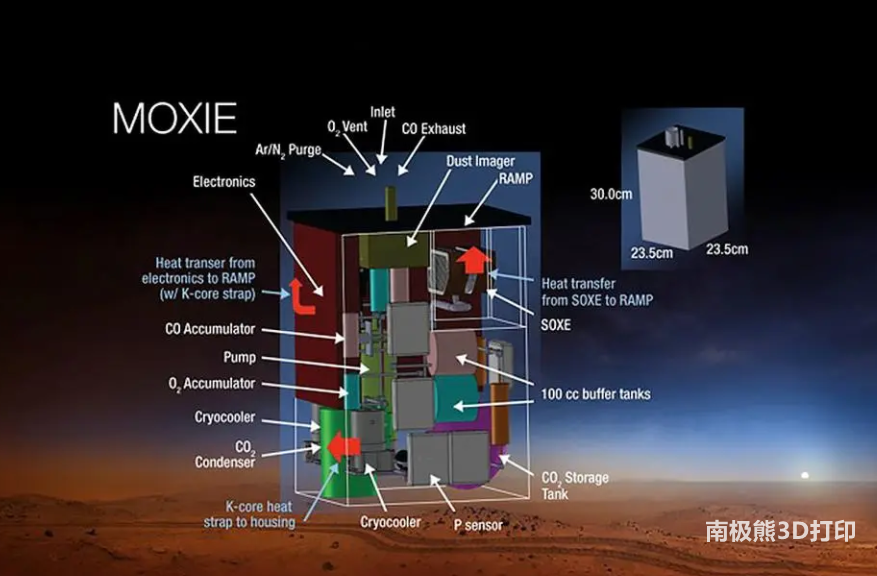 "毅力號 "火星車的其他6個3D打印部件在 "火星氧氣原位資源利用實驗 "儀器中,簡稱MOXIE。這個設(shè)備將測試新的技術(shù),未來可以生產(chǎn)工業(yè)數(shù)量的氧氣,在火星上制造火箭推進劑,幫助宇航員發(fā)射回地球。