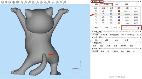 ②在左側(cè)視圖工具頁,選擇“多截面”,類型中即指不同方向軸的截面,當(dāng)然我們也可以點擊展開后自行選擇別的截面,如3點確定一個別的角度的截面。勾選激活某個截面后,拉動下方的移動軸即可控制模型上的截面的移動。同時我們也可以在“剖視”欄選擇不同的視圖效果,把截面移動至自己需要切割的位置。