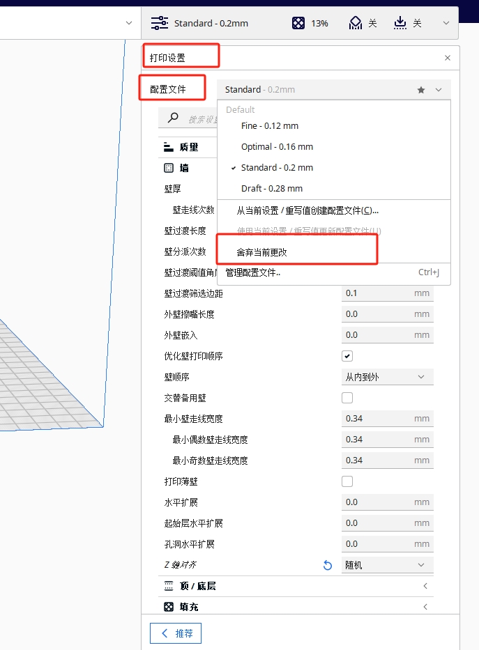 很簡單,您只需在軟件右邊“打印設(shè)置”-“配置文件”中點(diǎn)擊“舍棄當(dāng)前更改”就可以恢復(fù)到默認(rèn)設(shè)置。
